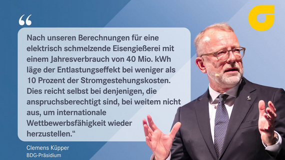 Deutschlands energieintensive, mittelständische Gießerei-Industrie ist im Bundesverband der Deutschen Gießerei-Industrie (BDG) organisiert. Der BDG vertritt die Interessen der Branche in technischen, wirtschaftspolitischen und weiteren Themen. Er ist eng vernetzt anderen Industrieverbänden wie dem BDI. Der Verband hat seinen Sitz im Haus der Gießerei-Industrie (HDGI) in Düsseldorf. Darin befinden sich außerdem die Tochter BDG-Service mit der VDG Akademie, der Personenverband VDG (Verein Deutscher Gießerei-Fachleute), die Forschungsvereinigung Gießerei-Industrie (FVG), der Verband Deutscher Druckgießereien (VDD) sowie der europäische Verband EFF (vormals CAEF).