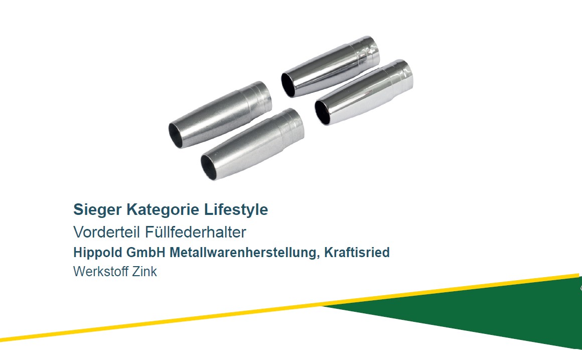 Das Griffstück eines Füllfederhalters hat die Anforderung an einen haptischen „Cool-touch-Effekt“ zu erfüllen. Ein Grund dafür das für dieses hochklassige Schreibgerät keine Kunststoffspritzguss-Technologie gewählt wurde. Eine Fertigung als Frästeil ist aufgrund der Bauteilgeometrie nicht möglich. Bei der Herstellung des Griffteils wird die Eigenschaft von Zinkdruckguss zur Umsetzung dünnwandiger Gussteile mit Wandungsdicken von 0,25 mm genutzt. Die Anforderungen an höchstes Oberflächendesign und Haptik im Bereich Lifestyle werden durch nur geringen Polieraufwand und eine verchromte Oberfläche erfüllt. In der gießtechnischen Umsetzung der Hülsengeometrie überzeugt die technische Umsetzung eines anspruchsvollen Entform-Prozesses. Selbst ein Griffteil eines Füllfederhalters besitzt bestimmte Funktionen und Klemmeigenschaften im Innenbereich. Die Umsetzung dieser Funktionen wurden bei einer geringen Gussteilgröße und filigranen Innenkontur überzeugend umgesetzt.