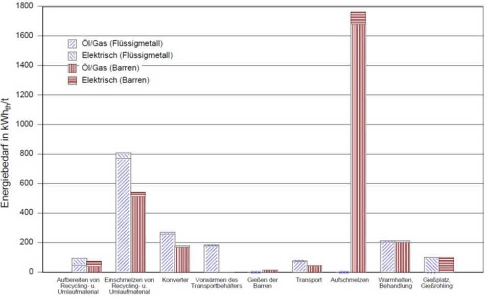 Für einen Schachtofen wird eine theoretische spezifische Schmelzenergie von 600 kWhth/tAL angegeben, die sich bei einem reinen Einsatz von Blockmaterial auf 690 kWhth/tAL erhöht. Bei einem kombinierten Schmelz- und Warmhaltebetrieb wurden Daten für typische Schachtschmelzöfen von bis zu 900 kWhth/tAL ermittelt, wobei der Anteil für den Energieaufwand zum reinen Warmhalten der Schmelze mit 180 kWhth/tAL angegeben wird. Für die in Aluminiumgießereien teilweise noch eingesetzten Herd- und Wannenöfen wird der spezifische Energiebedarf mit bis zu 1.200 kWhth/tAL. angegeben.